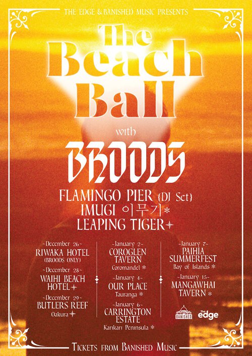 In support are psychedelic disco DJ duo Flamingo Pier, sure to bring crowds to an appropriate boiling point as they close out the show each night. Synth-pop R&B bedroom popstars Imugi join the bill for all January shows, and emerging Auckland producer Leaping Tiger will open the dancefloor in Waihi and Oakura.